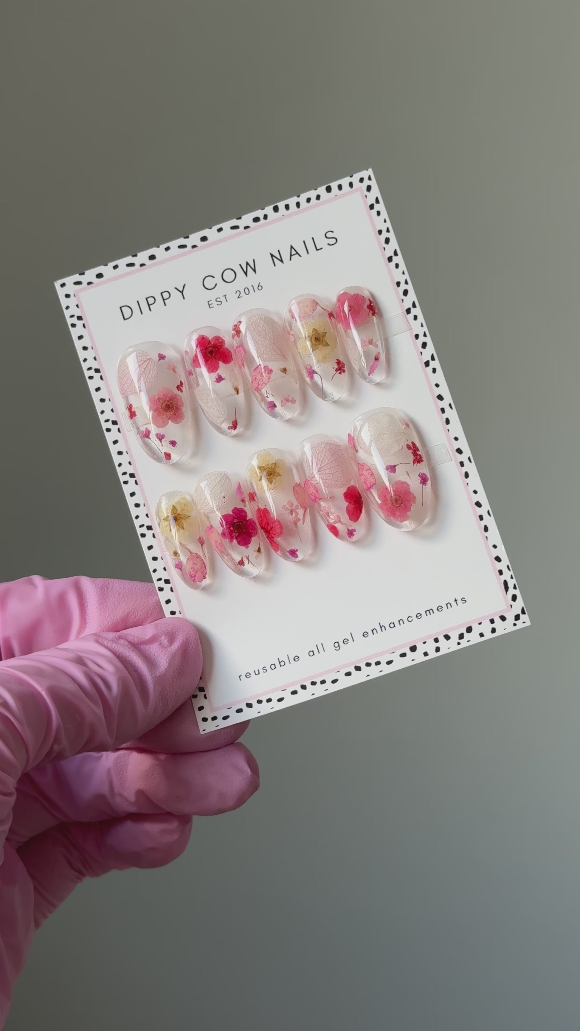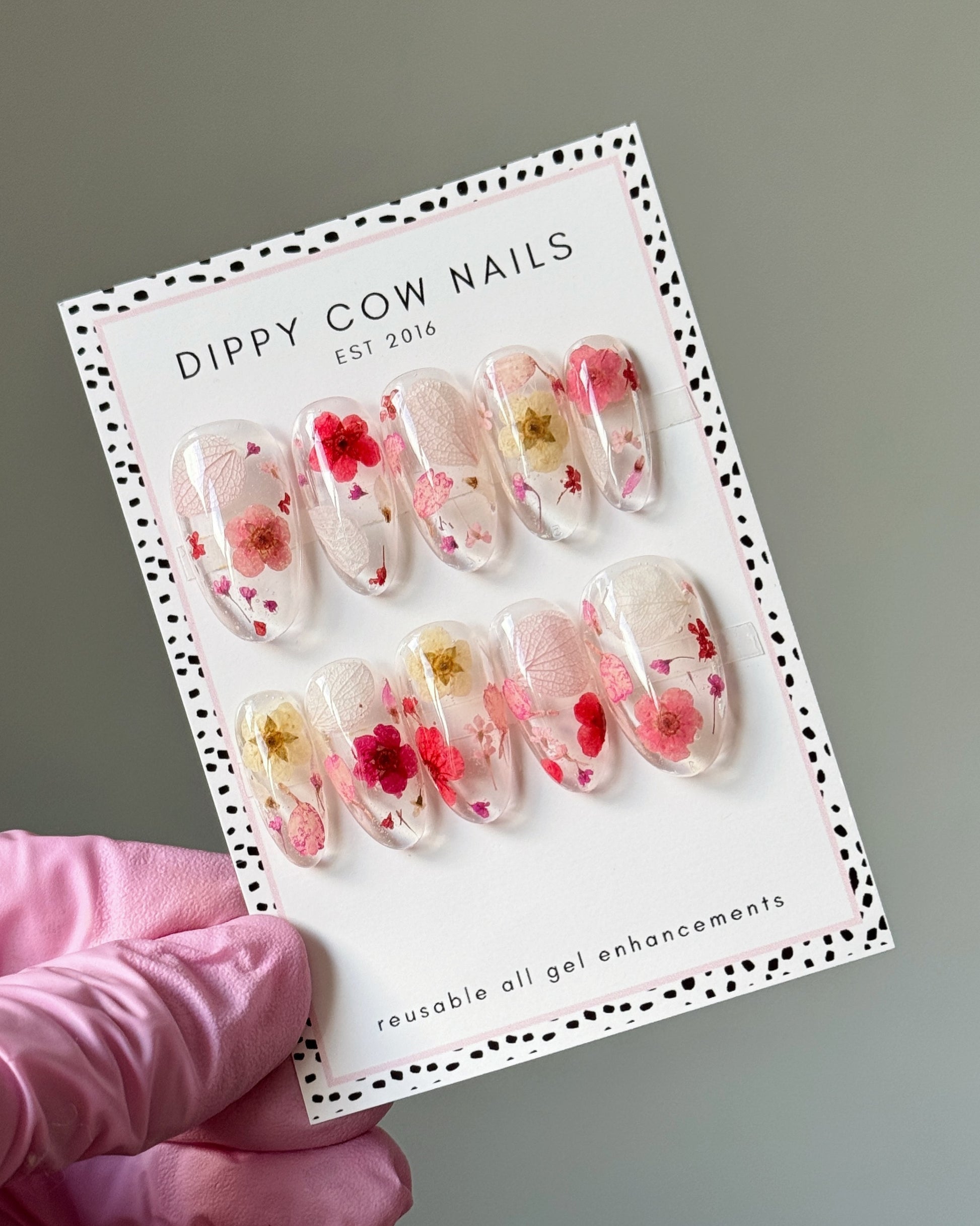 Set of 10 luxury gel press on nails with encapsulated dried flowers.